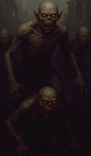 Ghule sind verweste, knochige Kreaturen, die sich ausschließlich von verrottendem Fleisch ernähren. Sie wirken wie eine groteske Mischung aus Leiche und Insekt – mit aschenfarbener, schuppiger Haut, faulenden Wunden und gelblich glühenden Augen.