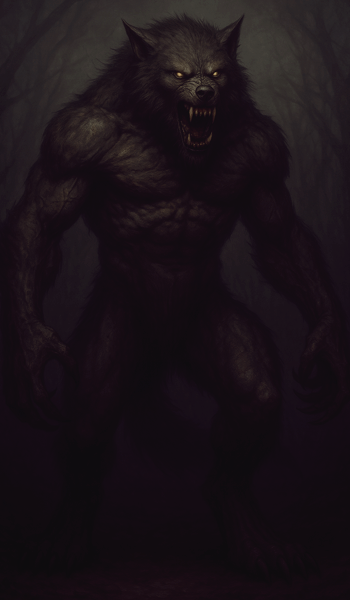 Eine zwischen 2,5 und über 3 Meter große, aufrecht gehende Wolfsgestalt mit entfernt humanoiden Vorderpranken.